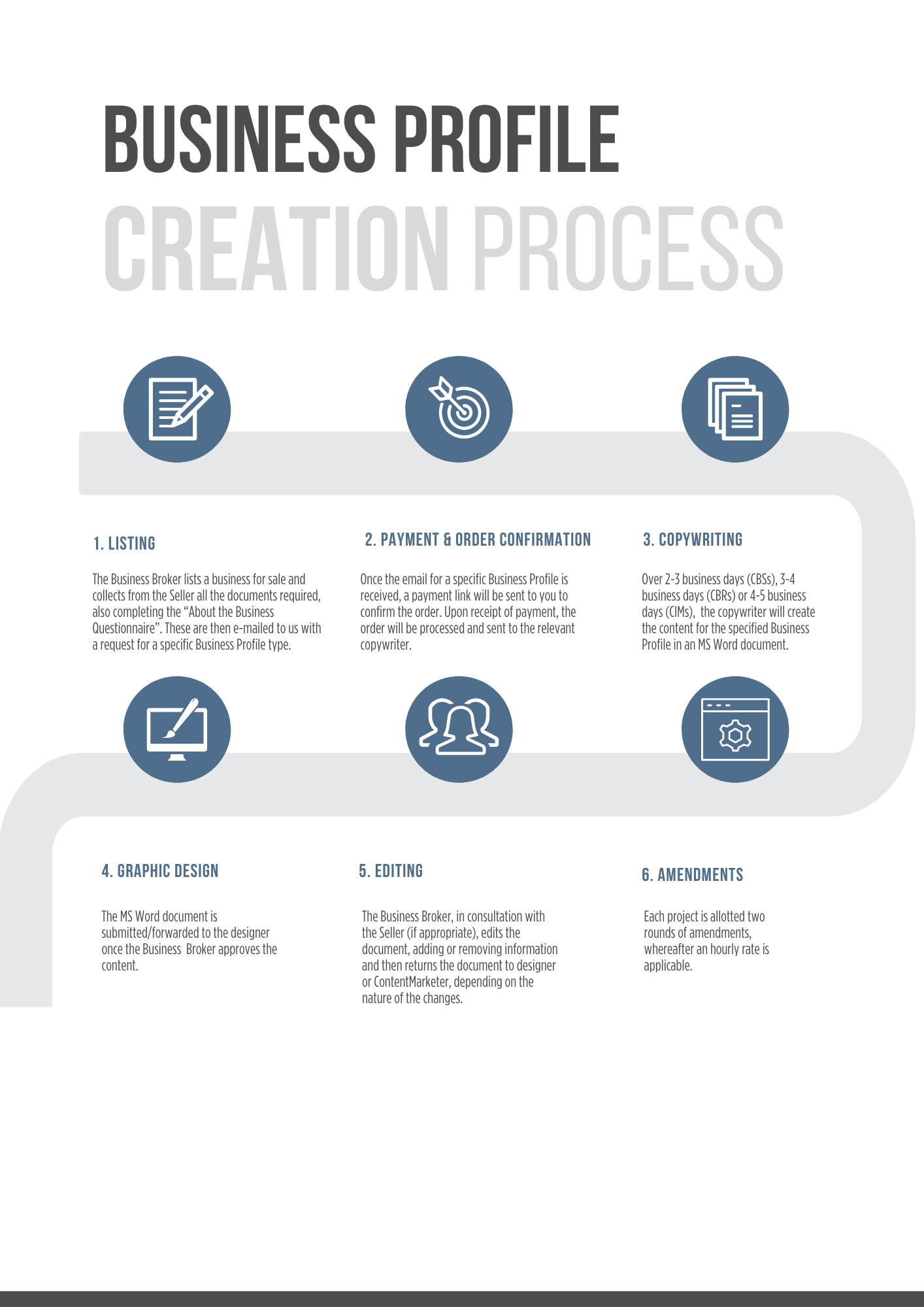 Our services are designed to alleviate the burden of writing marketing content specifically related to business profiles. This enables you to strategically focus on listings, managing the buy-and-sell process, and seller expectations, while we take care of the content.
